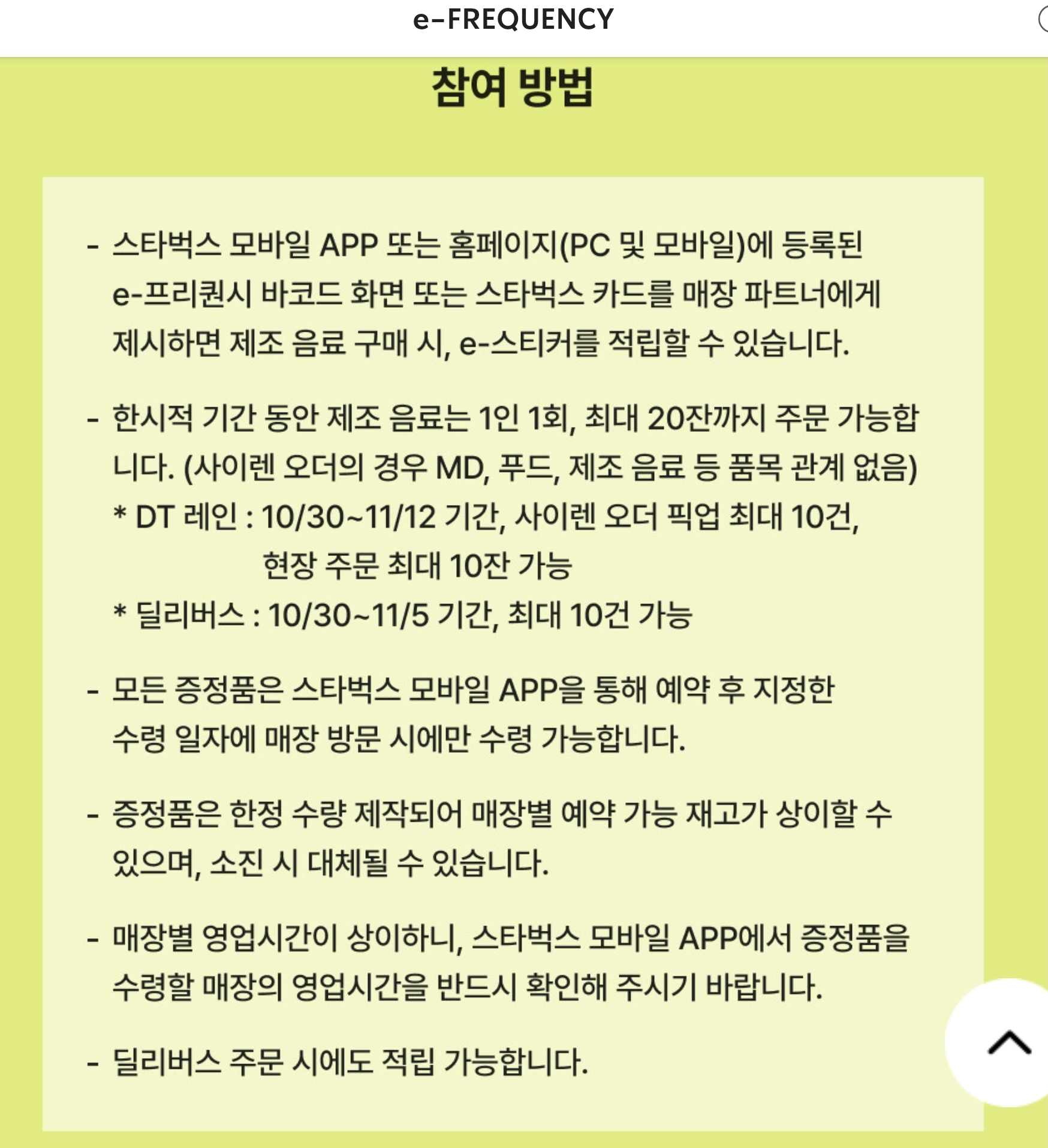 앱에 e-프리퀀시 바코드만 보여주면 자동으로 적립돼서 편했고, 딜리버스 주문도 적립되길래 바쁜 날은 딜리버스로 살짝 치팅(?)도 했어요. 1일 20잔 제한은 있었지만 저는 아주 평범하게 모아서 무리 없이 완료했습니다.